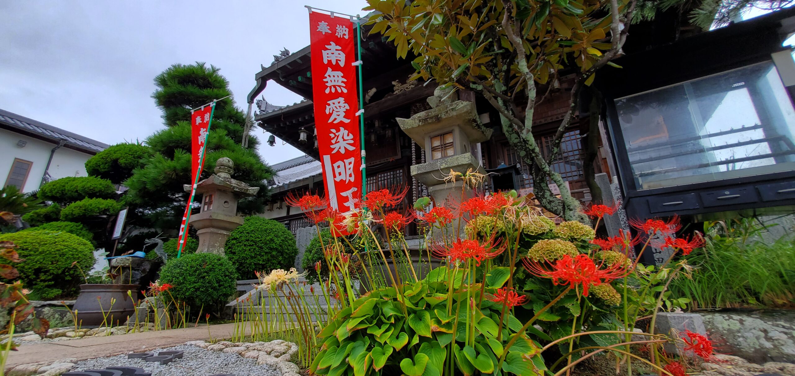 毎年どんなに暑くても、雨が少なくても秋彼岸中日(23日)には満開になる彼岸花ですが、どうしたことか今年は23日にはチラホラとしか咲かず、寂しい思いがしましたが、頑張って咲いてくれている花に「咲いてくれてありがとう」と感謝の思いでいっぱいになり、愛おしさを感じました。約一週間遅れの今日、お寺の境内の彼岸花が満開を迎えています。